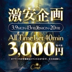 こんにちは😃 いつもたくさんのご来店いただき、 ありがとうございます🥺 本日も宜しくお願い致します❤️ 3月9日(月)から3月13日(金)と 3月16日(月)から3月20日(金)の10日間 フリーでご来店いただいたお客様は 1SET40分3000円の激安EVENTです🥰 この機会にぜひコルサーレへ お越しください❤️ たくさんのお客様とお会いできることを 楽しみにお待ちしてます🫠